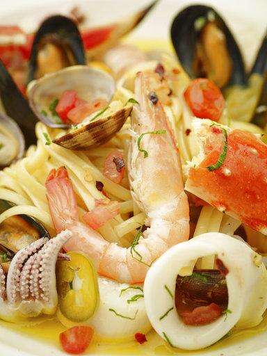 This simple sauce is a traditional mix of aromatic ingredients, white wine, and fish broth that will lightly coat the fish(es) and pasta. For our main ingredients, we've chosen the seafood heavy hitters: crab, shrimp, calamari, clams, mussels, scallops, and white fish. You can serve the shellfish in their shells for a dramatic presentation, or serve them shucked for a more user-friendly experience.