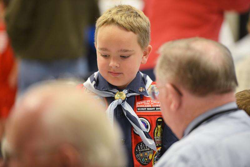 Archer Early, 9, wears his Cub Scout uniform as he visits with his grandfather John Early, a U.S. Army veteran, one of dozens of military veterans participating in Veterans Day activities at Hampshire Elementary School.