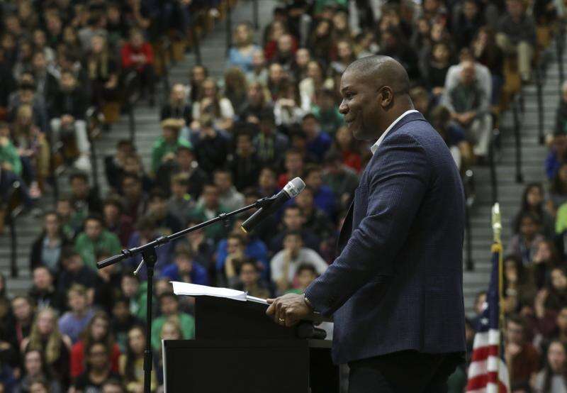 Army veteran Wes Becton speaks during a Veterans Day assembly at York High School on Friday in Elmhurst.