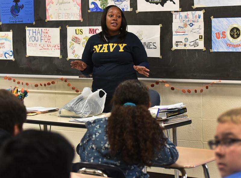 Petty Officer 2nd Class LaTresha Hazelwood of Streamwood talks to 7th graders after a school assembly. Canton Middle School in Streamwood partnered with Arlington Heights-based military charity Salute, Inc. to raise funds with a pie throwing event involving the principal, vice principal and dean.