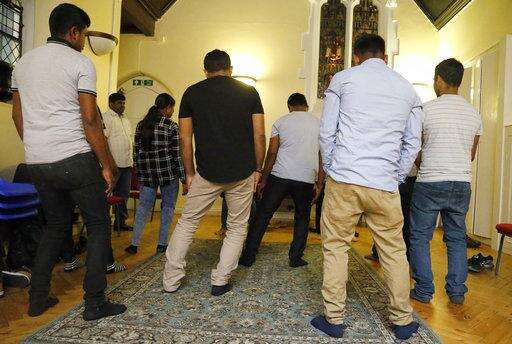 In this July 27, 2017, photo, Sri Lankans, many of whom said they were tortured in their home country, gather at a church in London. Sri Lankan torture victims seeking asylum in Europe travel to London each week for English classes, counseling sessions and lunch. Sometimes, human rights investigators meet new victims willing to give their testimonies. (AP Photo/Frank Augstein) The Associated Press