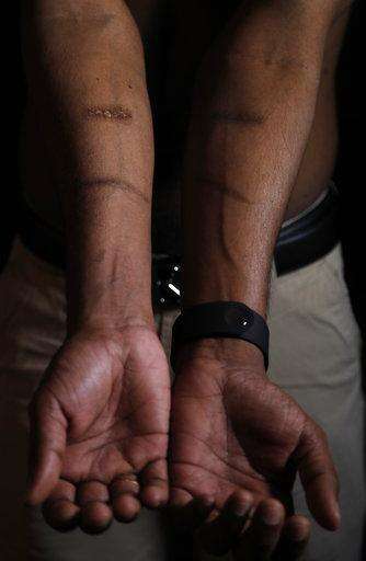 In this July 20, 2017, photo, a Sri Lankan man known as Witness #205 shows scars on his arms during an interview in London. The 22-year old, like the majority of the other victims, said one of his captors identified himself as a member of Sri Lanka’s Criminal Investigations Department. (AP Photo/Frank Augstein) The Associated Press
