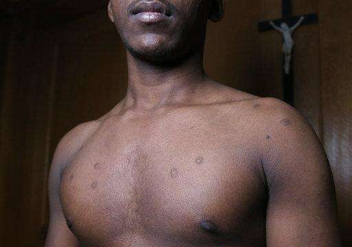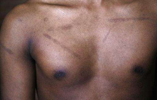 In this July 27, 2017, photo, a Sri Lankan teen known as Witness #267 shows scars and marks on his chest during an interview in London. The 19-year old said that he was raped and burned more than 60 times with cigarettes during his detention earlier in the year in Sri Lanka. Trembling when asked questions, he says, “I can’t. I’m not anywhere near through this.” (AP Photo/Frank Augstein) The Associated Press