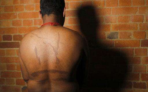 In this July 18, 2017, photo, a Sri Lankan man known as Witness #249 shows brand marks on his back during an interview in London. He said his captors used hot iron rods to make the marks meant to symbolize tiger stripes for the Tamil Tigers rebel group. He, like others, escaped Sri Lanka and was smuggled to Europe where he awaits a decision on political asylum. (AP Photo/Frank Augstein) The Associated Press