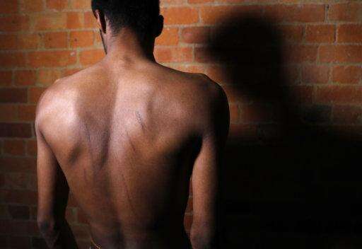 In this July 20, 2017, photo, a Sri Lankan man known as Witness #244 shows his scars during an interview in London. Most nights he wakes to nightmares and survives on a mixture of sleeping pills and anti-depressants. Raped, branded and beaten repeatedly, more than 50 ethnic Tamil men seeking political asylum in Europe have come forward to say they were abducted and tortured under Sri Lanka’s current regime. (AP Photo/Frank Augstein) The Associated Press