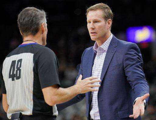 Chicago Bulls head coach Fred Hoiberg, right, argues a call with referee Scott Foster during the first half of an NBA basketball game against the San Antonio Spurs, Saturday, Nov. 11, 2017, in San Antonio. (AP Photo/Darren Abate) The Associated Press