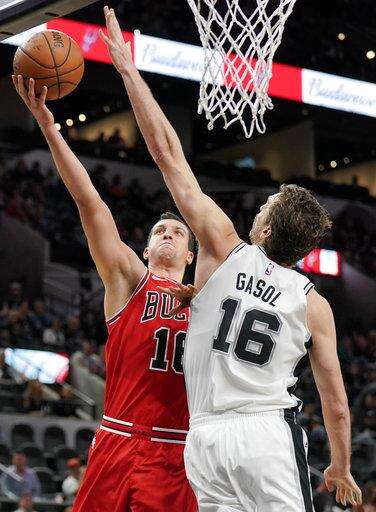 Chicago Bulls forward Paul Zipser, left, shoots against San Antonio Spurs center Pau Gasol, of Spain, during the first half of an NBA basketball game, Saturday, Nov. 11, 2017, in San Antonio. (AP Photo/Darren Abate) The Associated Press