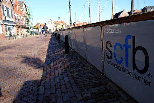 In this Nov. 6, 2017, photo, a man rides a bicycle next to self-raising dike n in the Dutch fishing village of Spakenburg, Netherlands. The 300-meter long dike that is raised by the very flood waters it is designed to hold back is an example of Dutch ingenuity in flood prevention that is becoming a major export earner for this low-lying nation. (AP Photo/Mike Corder) The Associated Press