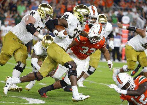 Notre Dame running back Josh Adams (33) runs as Miami defensive lineman Trent Harris (33) defends during the first half of an NCAA college football game, Saturday, Nov. 11, 2017, in Miami Gardens, Fla. (AP Photo/Lynne Sladky) The Associated Press
