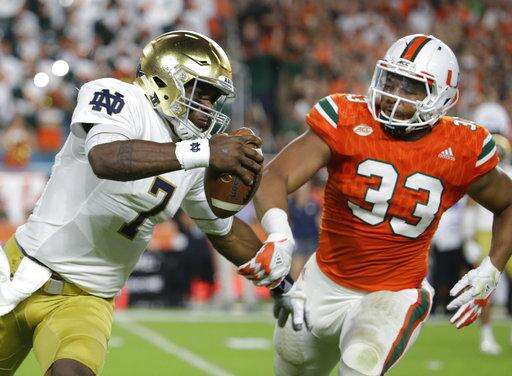 Notre Dame quarterback Brandon Wimbush (7) runs as Miami defensive lineman Trent Harris (33) defends during the first half of an NCAA college football game, Saturday, Nov. 11, 2017, in Miami Gardens, Fla. (AP Photo/Lynne Sladky) The Associated Press
