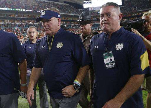 Notre Dame head coach Brian Kelly, left, walks to the locker room after the first half of an NCAA college football game against Miami, Saturday, Nov. 11, 2017, in Miami Gardens, Fla. Miami leads at halftime, 27-0. (AP Photo/Lynne Sladky) The Associated Press