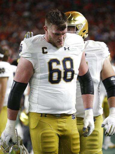 Notre Dame offensive lineman Mike McGlinchey (68) walks to the bench during the second half of an NCAA college football game against Miami, Saturday, Nov. 11, 2017, in Miami Gardens, Fla. Miami won 41-8. (AP Photo/Lynne Sladky) The Associated Press