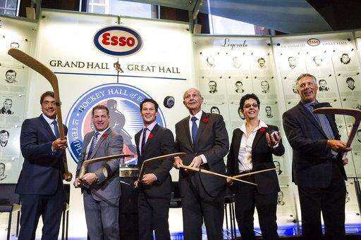 2017 Hockey Hall of Fame inductees, from left, Teemu Selanne, Mark Recchi, Paul Kariya, Jeremy Jacobs, Danielle Goyette and Dave Andreychuk put pucks in the air during a new conference in Toronto, Friday, Nov. 10, 2017. (Christopher Katsarov/The Canadian Press via AP) The Associated Press