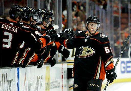 Anaheim Ducks left wing Kevin Roy, left, celebrates after his first NHL goal, during the first period of a hockey game against the Boston Bruins in Anaheim, Calif., Wednesday, Nov. 15, 2017. (AP Photo/Chris Carlson) The Associated Press