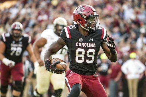 South Carolina wide receiver Bryan Edwards (89) runs with the ball against Wofford during the first half of an NCAA college football game, Saturday, Sept. 18, 2017, in Columbia, S.C. (AP Photo/Sean Rayford)