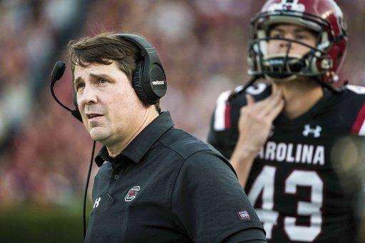 South Carolina head coach Will Muschamp watches the video screen during the second half of an NCAA college football game against Wofford on Saturday, Nov. 18, 2017 in Columbia, S.C. South Carolina defeated Wofford 31-10. (AP Photo/Sean Rayford)