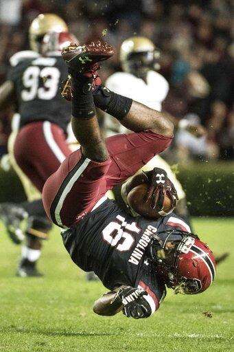 South Carolina defensive back Rashad Fenton (16) flips in the air after intercepting a pass against Wofford during the second half of an NCAA college football game on Saturday, Nov. 18, 2017 in Columbia, S.C. South Carolina defeated Wofford 31-10. (AP Photo/Sean Rayford)