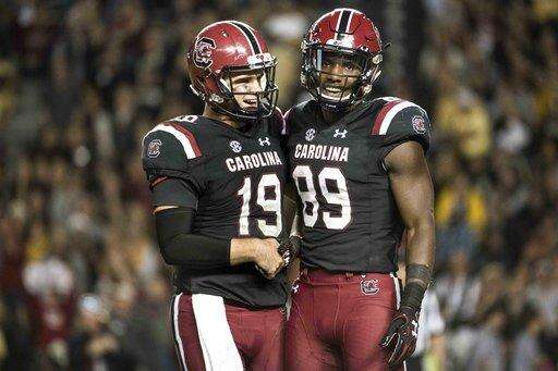 South Carolina quarterback Jake Bentley (19) and Bryan Edwards (89) celebrate after a touchdown during the second half of an NCAA college football game against Wofford on Saturday, Nov. 18, 2017 in Columbia, S.C. South Carolina defeated Wofford 31-10. (AP Photo/Sean Rayford)