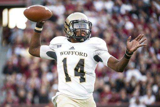 Wofford quarterback Brandon Goodson (14) attempts a pass against South Carolina during the first half of an NCAA college football game, Saturday, Sept. 18, 2017, in Columbia, S.C. (AP Photo/Sean Rayford)