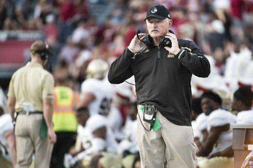 Wofford head coach Mike Ayers watches from the sideline during the first half of an NCAA college football game against South Carolina on Saturday, Nov. 18, 2017 in Columbia, S.C. South Carolina defeated Wofford 31-10. (AP Photo/Sean Rayford)