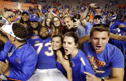 Florida offensive lineman Martez Ivey (73) celebrates with fans after defeating UAB in an NCAA college football game, Saturday, Nov. 18, 2017, in Gainesville, Fla. (AP Photo/John Raoux)