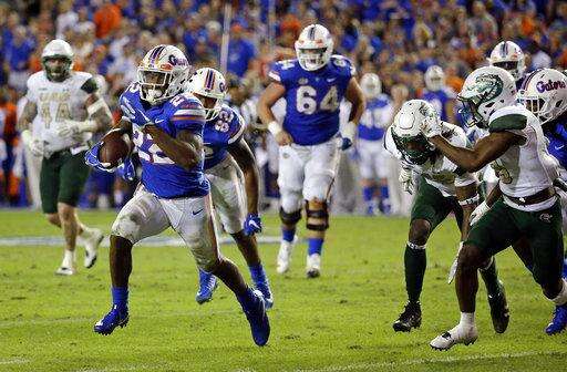 Florida running back Lamical Perine (22) runs past the UAB defense for a 15-yard touchdown during the second half of an NCAA college football game, Saturday, Nov. 18, 2017, in Gainesville, Fla. (AP Photo/John Raoux)