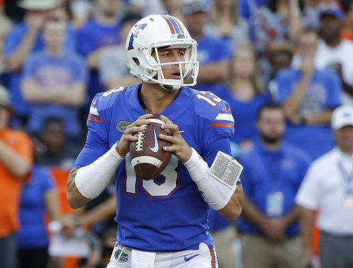 Florida quarterback Feleipe Franks (13) looks for a receiver during the first half of an NCAA college football game against UAB, Saturday, Nov. 18, 2017, in Gainesville, Fla. (AP Photo/John Raoux)