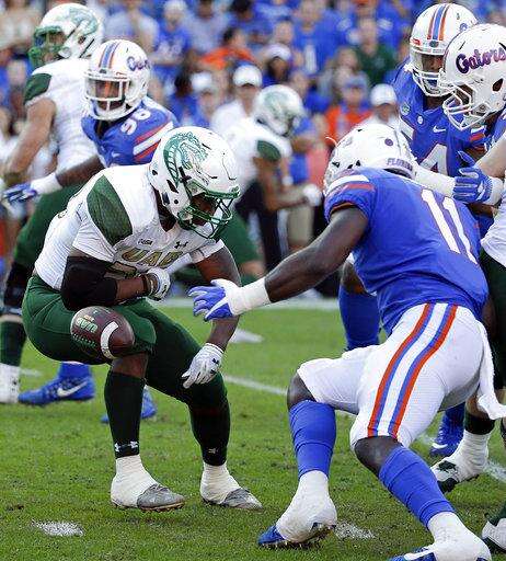 UAB running back Spencer Brown, left, fumbles the ball in front of Florida linebacker Vosean Joseph (11) during the first half of an NCAA college football game, Saturday, Nov. 18, 2017, in Gainesville, Fla. Florida recovered the fumble. (AP Photo/John Raoux)