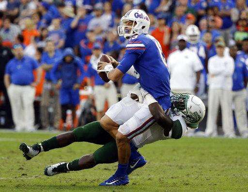 Florida quarterback Feleipe Franks, front, is sacked by UAB linebacker Chris Woolbright during the first half of an NCAA college football game, Saturday, Nov. 18, 2017, in Gainesville, Fla. (AP Photo/John Raoux)