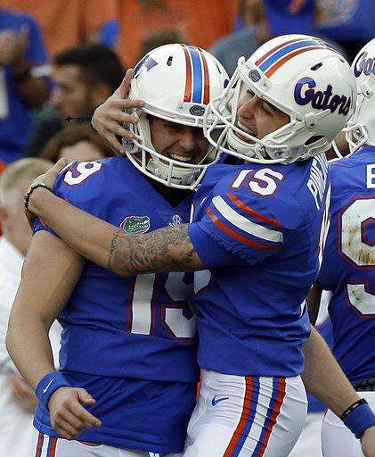 Florida place kicker Eddy Pineiro (15) celebrates a 50-yard field goal against UAB with teammate Johnny Townsend (19) during the first half of an NCAA college football game, Saturday, Nov. 18, 2017, in Gainesville, Fla. (AP Photo/John Raoux)