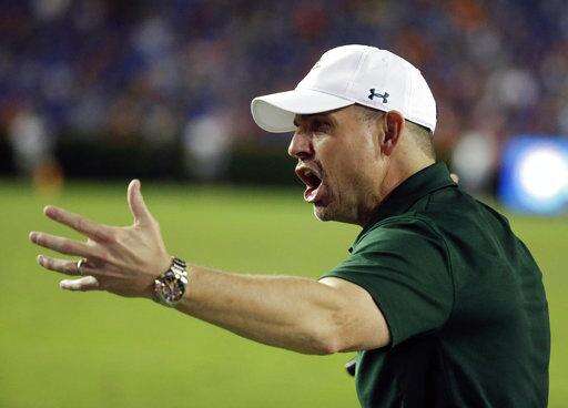 UAB head coach Bill Clark disputes a call by officials during the second half of an NCAA college football game against Florida, Saturday, Nov. 18, 2017, in Gainesville, Fla. (AP Photo/John Raoux)