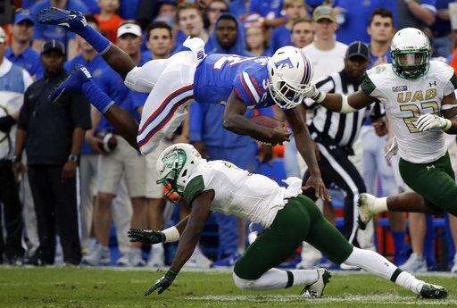 Florida running back Adarius Lemons, top, is upended by UAB cornerback Darious Williams, bottom, as cornerback Broderick Thomas (22) comes in to help during the first half of an NCAA college football game, Saturday, Nov. 18, 2017, in Gainesville, Fla. (AP Photo/John Raoux)