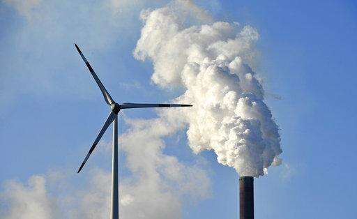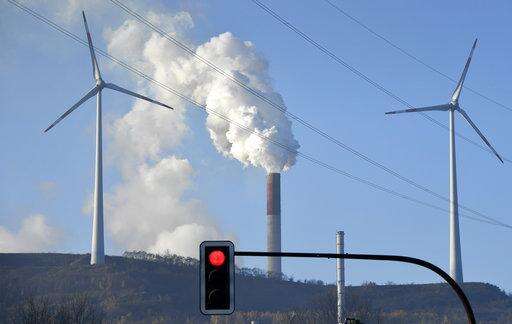 A coal-burning power plant steams behind wind generators in Gelsenkirchen, Germany while the 23rd UN Conference of the Parties (COP) climate talks end in Bonn, Germany, Friday, Nov. 17, 2017. (AP Photo/Martin Meissner)