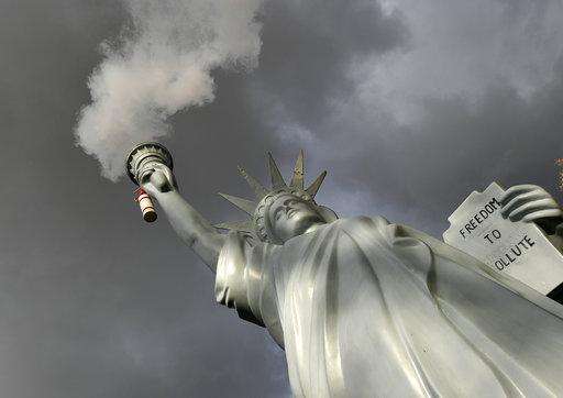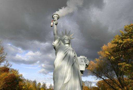 A replica of the Statue of Liberty by Danish artist Jens Galschiot emits smoke in a park outside the 23rd UN Conference of the Parties (COP) climate talks in Bonn, Germany, Friday, Nov. 17, 2017. (AP Photo/Martin Meissner)