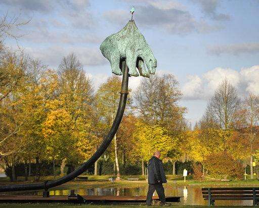 A man passes by the sculpture with a polar bear on a spear by Danish artist Jens Galschiot in a park outside the 23rd UN Conference of the Parties (COP) climate talks in Bonn, Germany, Friday, Nov. 17, 2017. (AP Photo/Martin Meissner)