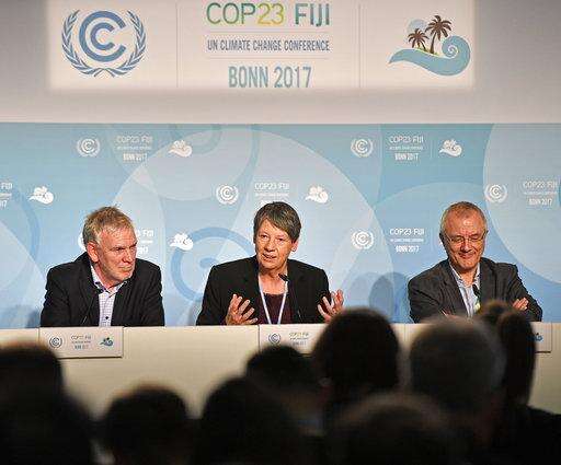 German environment minister Barbara Hendricks, center, talks to the media at the 23rd UN Conference of the Parties (COP) climate talks in Bonn, Germany, Friday, Nov. 17, 2017. (AP Photo/Martin Meissner)