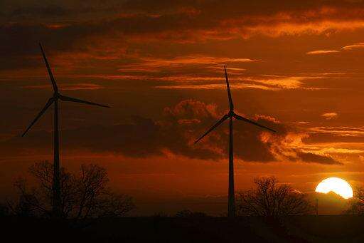 The sun sets behind wind turbines near Pokrent, northern Germany, Friday, Nov. 17, 2017. (Jens Buettner/dpa via AP)
