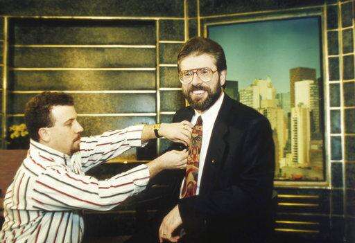 FILE - In this Monday, Jan. 31, 1994 file photo, Gerry Adams, right, president of Sinn Fein, is assisted by engineer Tony Mandile as Adams gets ready for an interview with talk show host Larry King at CNN studios in New York City. Gerry Adams has announced that he plans to step down as leader of Sinn Fein next year after heading the party for over 30 years. Adams said in a speech at the party's annual conference in Dublin on Saturday, Nov. 18, 2017 that he will not stand for the next Irish parliamentary election.(AP Photo/Chrystyna Czajkowsky,file) The Associated Press
