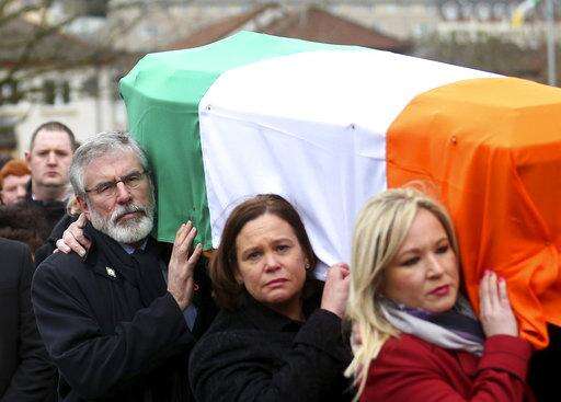 FILE - In this Thursday, March 23, 2017 file photo, Sinn Fein's Gerry Adams, left, Mary Lou McDonald, centre, and Michelle O'Neill carry the coffin of former IRA commander and Sinn Fein deputy leader Martin McGuinness to St Columba's Church in Londonderry, Northern Ireland. Gerry Adams has announced that he plans to step down as leader of Sinn Fein next year after heading the party for over 30 years. Adams said in a speech at the party's annual conference in Dublin on Saturday, Nov. 18, 2017 that he will not stand for the next Irish parliamentary election. (AP Photo/Peter Morrison, file) The Associated Press
