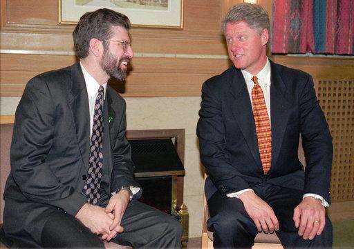 FILE - In this Thursday Nov. 30, 1995 file photo, President Bill Clinton meets with Sinn Fein President Gerry Adams, during a reception at Queen's University in Belfast, Northern Ireland. Gerry Adams has announced that he plans to step down as leader of Sinn Fein next year after heading the party for over 30 years. Adams said in a speech at the party's annual conference in Dublin on Saturday, Nov. 18, 2017 that he will not stand for the next Irish parliamentary election. (AP Photo/Joe Marquette, file) The Associated Press