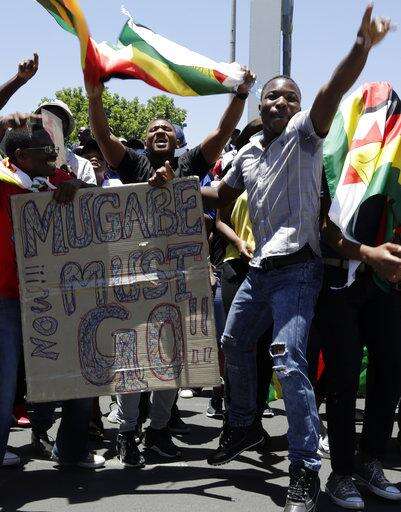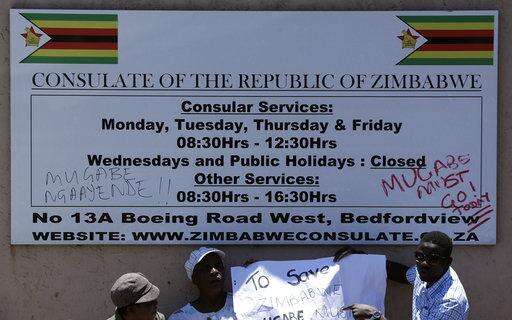 People gather to demonstrate for the ouster of 93-year-old President Robert Mugabe, outside the Zimbabwe Consulate in Johannesburg, South Africa, Saturday, Nov. 18, 2017. The 93-year-old Mugabe, the world's oldest head of state, is said to be asking for more time amid negotiations with regional leaders that seek his exit with a veneer of dignity. (AP Photo/Themba Hadebe)