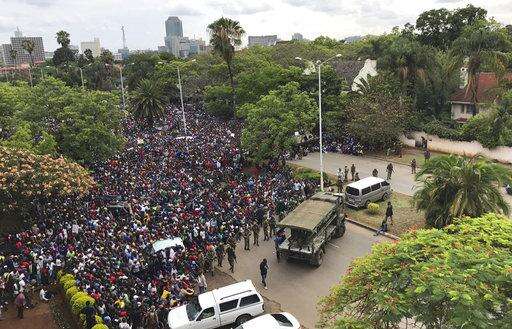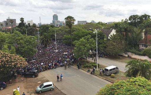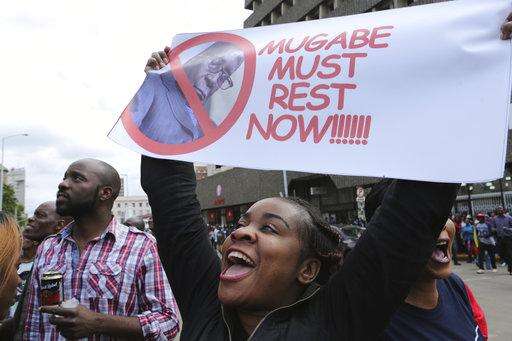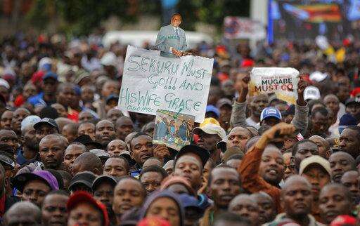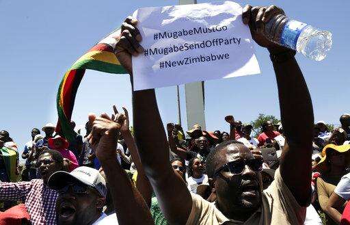 People gather to demonstrate for the ouster of 93-year-old President Robert Mugabe who is virtually powerless and deserted by most of his allies, in Harare, Zimbabwe, Saturday, Nov. 18, 2017. Some of the several thousand demonstrators in Zimbabwe's capital are removing street signs with the name of President Robert Mugabe as pressure builds for the longtime leader to go. (AP Photo/Ben Curtis)