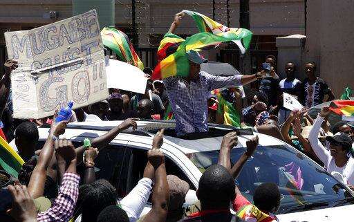 People cheer from the roof of a vehicle as euphoric crowds of several thousand people gathered in Zimbabwe's capital, Harare Saturday, Nov. 18, 2017 to demand the departure of President Robert Mugabe after nearly four decades in power. The 93-year-old Mugabe, the world's oldest head of state, is said to be asking for more time amid negotiations with regional leaders that seek his exit with a veneer of dignity. (AP Photo)