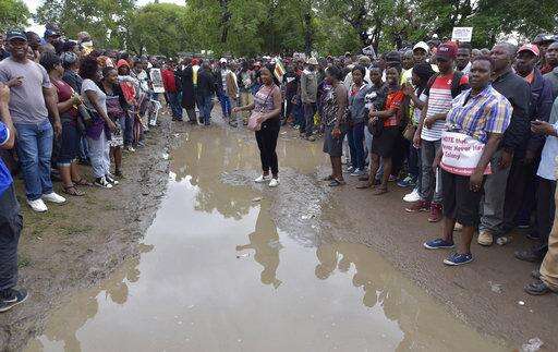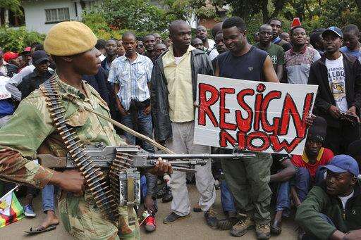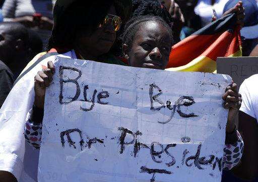People gather to demonstrate for the ouster of 93-year-old President Robert Mugabe who is virtually powerless and deserted by most of his allies, in Harare, Zimbabwe, Saturday, Nov. 18, 2017. Mugabe, the world's oldest head of state, is said to be asking for more time amid negotiations with regional leaders that seek his exit with a veneer of dignity. (AP Photo/Ben Curtis)