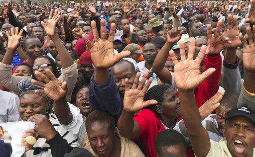 People brave the wet weather as crowds of several thousand gather in Harare, Saturday, Nov. 18, 2017. Opponents of Mugabe are demonstrating for the ouster of the 93-year-old leader who is virtually powerless and deserted by most of his allies. (AP Photo)