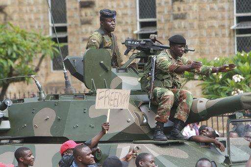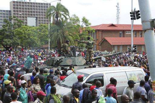People cheer on armed soldiers as crowds of several thousand gathered in Harare, Saturday, Nov. 18 2017 to demand the departure of President Robert Mugabe after nearly four decades in power. The 93-year-old Mugabe, the world's oldest head of state, is said to be asking for more time amid negotiations with regional leaders that seek his exit with a veneer of dignity. (AP Photo)