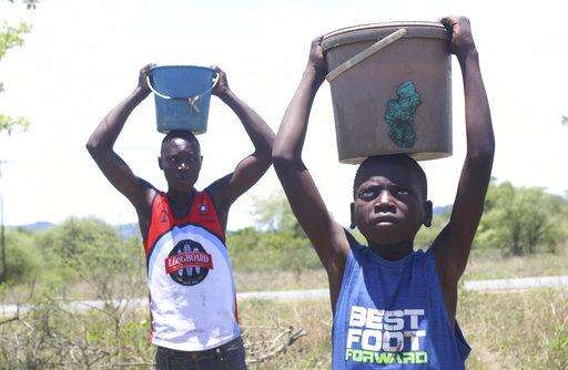 Young boys carry water on their heads in Ziboza village, Zimbabwe, Saturday, Nov. 18, 2017, as crowds of several thousand people gathered in the capital, Harare demanding the departure of President Robert Mugabe after nearly four decades in power. (AP Photo)