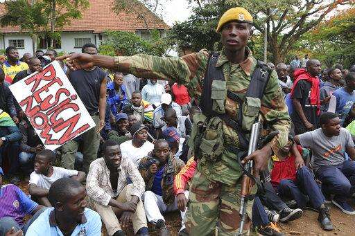 Armed soldiers control a euphoric crowd marching near State House in Harare, demanding the departure of President Robert Mugabe, Saturday Nov, 18, 2017. Zimbabweans giddy with joy raced through intersections, raising their arms in triumph. (AP Photo/Tsvangirayi Mukwazhi)