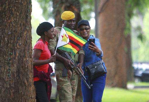 Euphoric marchers pose for pictures with armed soldiers outside State House in Harare as Zimbabweans marched demanding the departure of President Robert Mugabe, Saturday Nov, 18, 2017. The military, which put Mugabe under house arrest this week, has approved the demonstration that includes people from across the political spectrum. (AP Photo/Tsvangirayi Mukwazhi)