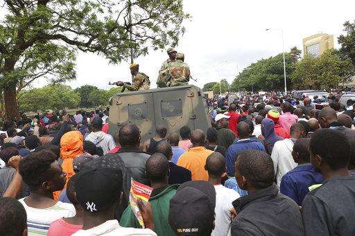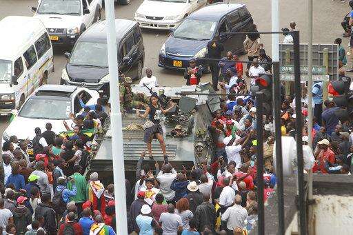 People begin to gather around a military vehicle in Harare Saturday, Nov. 18, 2017, demonstrating for the ouster of 93-year-old president Robert Mugabe who is virtually powerless and deserted by most of his allies. Zimbabwe's generals, have placed Mugabe under house arrest and have allowed him limited movement while talks on his exit from office unfold. (AP Photo/Christopher Torchia)